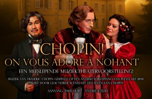 Een unieke avond vol passie, muziek en theater waarin de geest van Frédéric Chopin tot leven komt in het zomerhuis van George Sand in Nohant. Ontroerende scènes, vurige emoties in geacteerde scènes en de magische klanken van Chopin op een historische fortepiano van Pleyel uit 1848. Alles in authentieke kostuums, kap-en grimewerk en schitterende decors die de sfeer van de 19e eeuw subliem weten te raken. Laat je raken door schoonheid, liefde en de diepgang van een onvergetelijke vriendschap tussen kunst en leven.