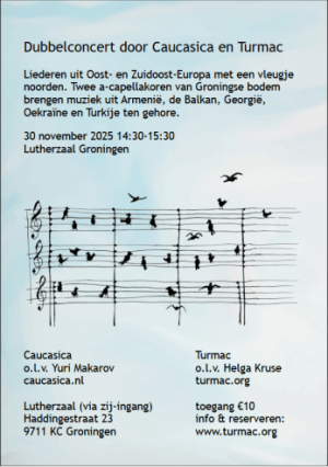 Twee a-capellakoren van Groningse bodem, Caucasica en Turmac, brengen muziek uit Armenië, de Balkan, Georgië, Oekraïne en Turkije ten gehore. Laat u meevoeren door warme klanken en mooie melodieën en waan u eventjes in een andere wereld …