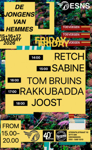 Retch (14:00), Sabine (15:00), Tom Bruins (16:00), Rakkubadda (17:00), Joost (18:00).