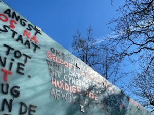 Jeroen Jongeleen staat bekend om zijn werk waarbij hij commentaren, opmerkingen en teksten van internetfora verzamelt en zichtbaar maakt in de openbare ruimte. Met And so on and so on gaat hij een stap verder: hij vroeg aan verschillende language models (AI-tekstprogramma's zoals Google Gemeni en ChatGPT) om proteststellingen te genereren, geïnspireerd op de razend populaire filosoof Slavoj Žižek, en kalkte deze vervolgens met zijn kenmerkende handschrift op de buitenkant van het Tschumipaviljoen. Zijn stijl doet denken aan handgemaakte protestborden en roept associaties op met demonstraties en activistische beeldtaal. De uitspraken suggereren kracht en verzet en roepen een gevoel van activisme op tegen ‘het systeem’, maar bieden ze uiteindelijk wel echte houvast of een concrete oplossing?
